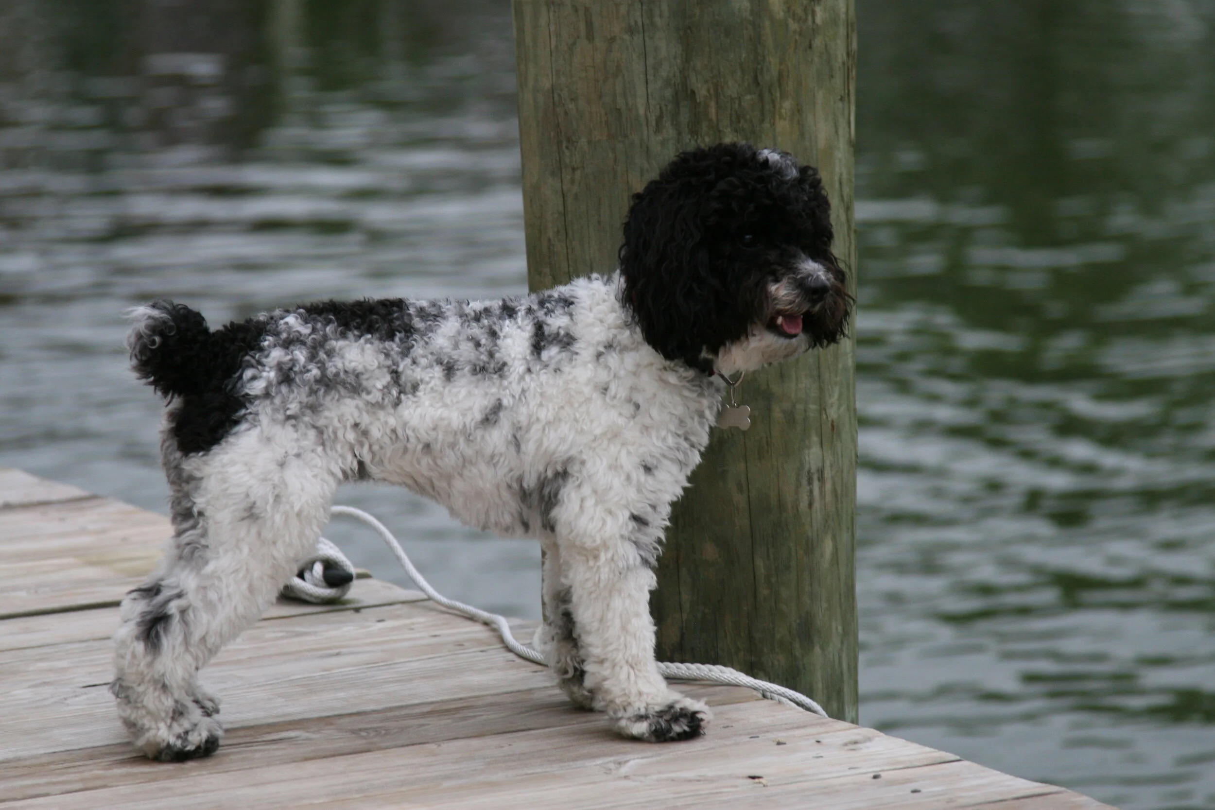Came back out and found that she had made it a fair way down the bulkhead. Realized that I was indeed going to have to go in (despite the fact that it was cold!) So I went down the doggie ramp (too far for me to jump off the dock) and luckily found it fairly shallow and that the bottom was not as gross as I had expected. Swam a ways over to grab her (while our neighbor across the canal looked on from where he had been fishing) and carried/swam with her back to the doggie ramp where I showed her how to go up.